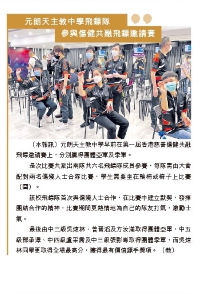 《公教報》報導元朗天主教中學飛鏢隊參與傷健共融飛鏢邀請賽